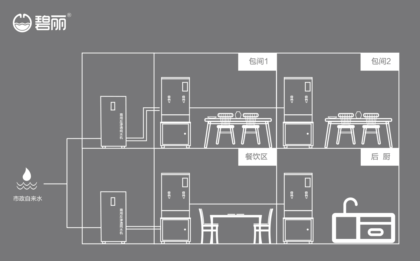 碧麗商用反滲透純水機將自來水集中處理后,把優(yōu)質的純凈水通過專用的供水管道輸送到各飲水點;